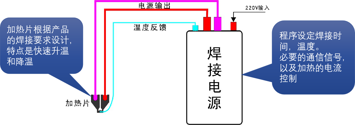 通過程序控制電源放電使專用的熱壓頭產生焦耳熱,達到設定的溫度。通過施加一定的壓力使熱壓頭與工件焊接部位充分接觸,傳導一定的熱量使工件錫層融化,然后保壓快速降溫,達到錫層固化連接。