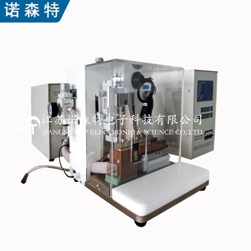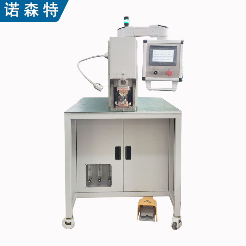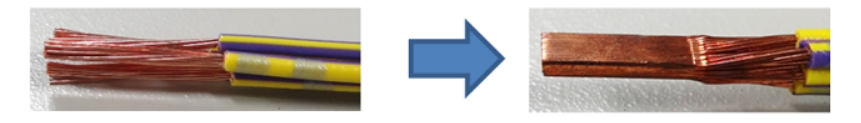 解決以上問題,可以使用線束壓方焊接機。由控制電源和壓方機構組成。在加壓時進行通電,由于金屬與金屬之間的接觸部位的電阻比較大而發熱、熔化被焊接在一起。利用此電阻發熱原理實現金屬浴金屬的接合。是利用陶瓷和電極夾持形成正方形型腔,用過大電流讓線束末端焊接成型。